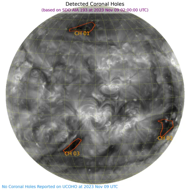 北半球(高緯度)東寄り、南半球西端と東寄りに小さなコロナホールがあります