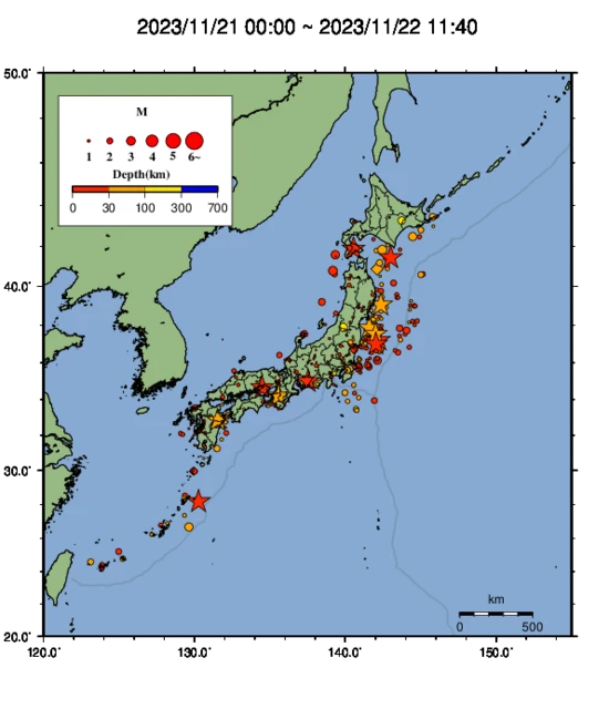 ●Hi-net日本地震分布と気象庁・・・hi-netの小笠原のデータは掲載日がずれて反映されるようです(翌々日に掲載)。掲載されないものもあるようなので気象庁の画像も付けます