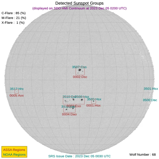 現時点で地球正面の黒点群は[3505, 3508, 3510, 3511]です。←黒点番号が振られていない活動領域でもフレアは発生しますので、あくまで目安
