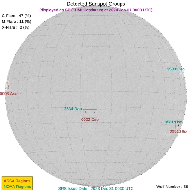 現時点で地球正面の黒点群は[3534]です。←黒点番号が振られていない活動領域でもフレアは発生しますので、あくまで目安として捉えてください。