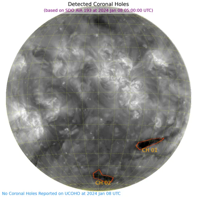 南の極の近く、南半球(高緯度)西側にコロナホールがあります