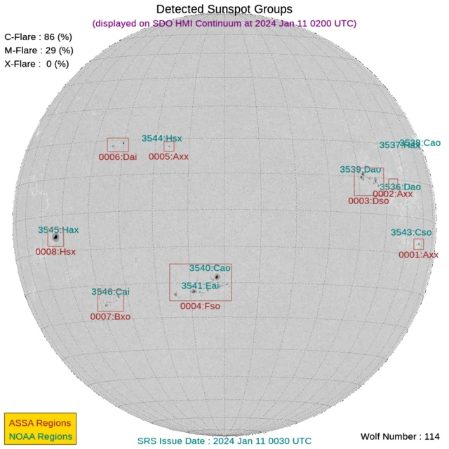 現時点で地球正面の黒点群は[3540, 3541, 3544]です。←黒点番号が振られていない活動領域でもフレアは発生しますので、あくまで目安として捉えてください。