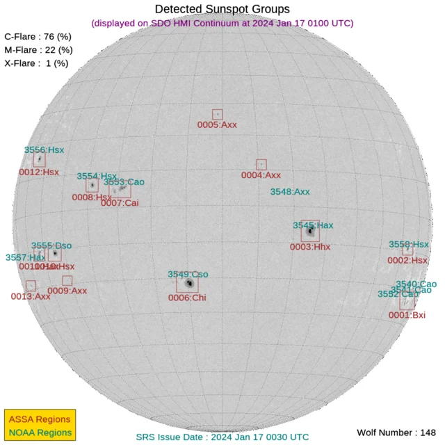 現時点で地球正面の黒点群は[3548, 3549]です。←黒点番号が振られていない活動領域でもフレアは発生しますので、あくまで目安として捉えてください。
