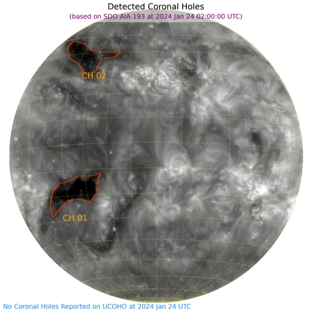 南半球東寄り、北半球(高緯度)東寄りにコロナホールがあります