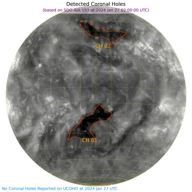 南半球中央付近、北半球(高緯度)中央付近にコロナホールがあります