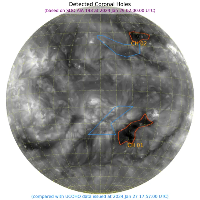 南半球西側、北半球(高緯度)西側にコロナホールがあります