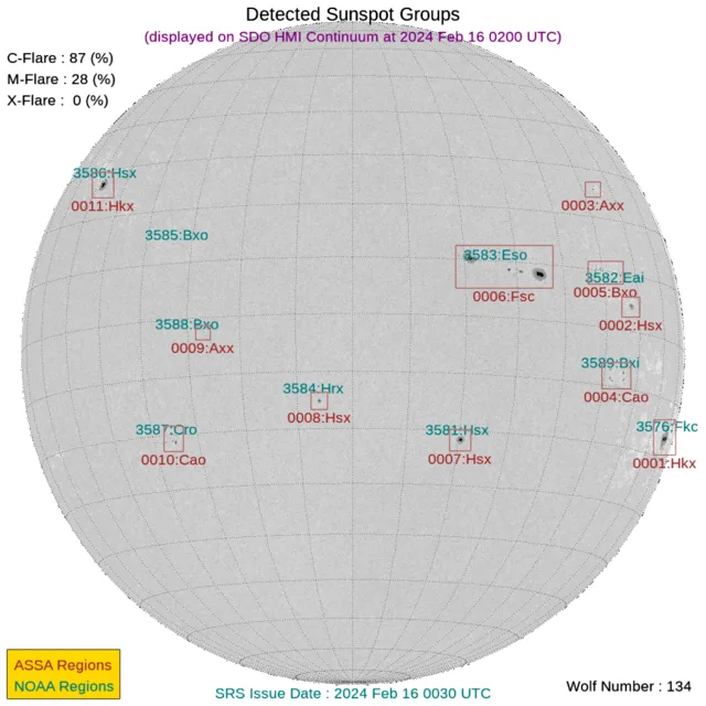 現時点で地球正面の黒点群は[3581, 3584]です。←黒点番号が振られていない活動領域でもフレアは発生しますので、あくまで目安として捉えてください。