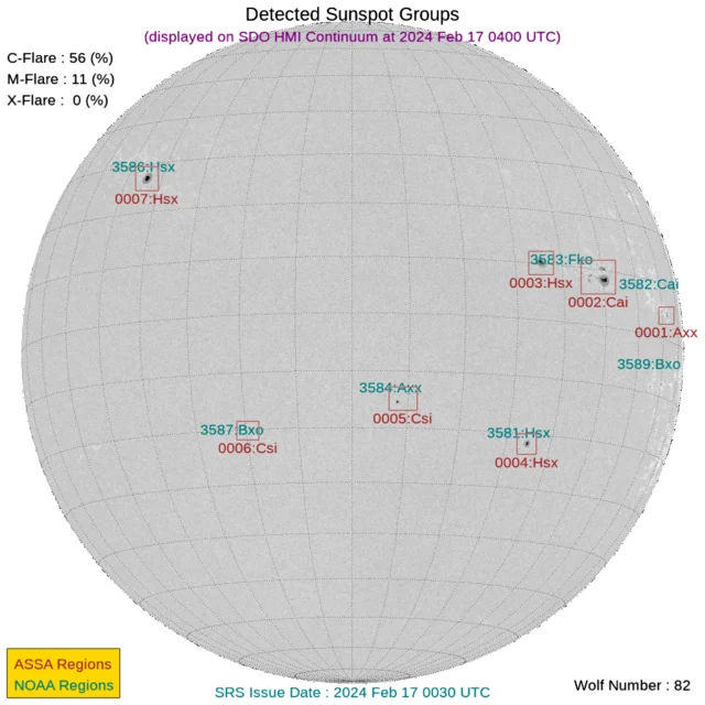 現時点で地球正面の黒点群は[3584, 3587]です。←黒点番号が振られていない活動領域でもフレアは発生しますので、あくまで目安として捉えてください。