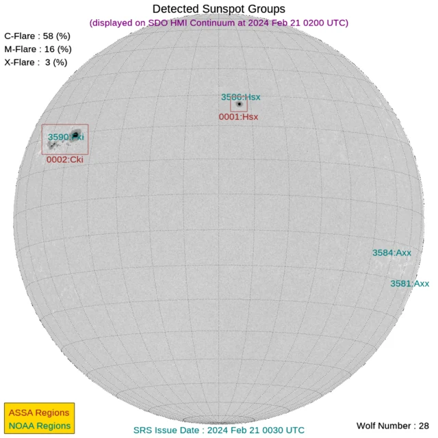 現時点で地球正面の黒点群は[3586]です。←黒点番号が振られていない活動領域でもフレアは発生しますので、あくまで目安として捉えてください。