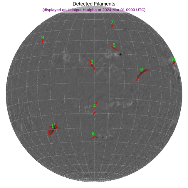 中心線付近と北半球西端、南半球東側にフィラメントがあります