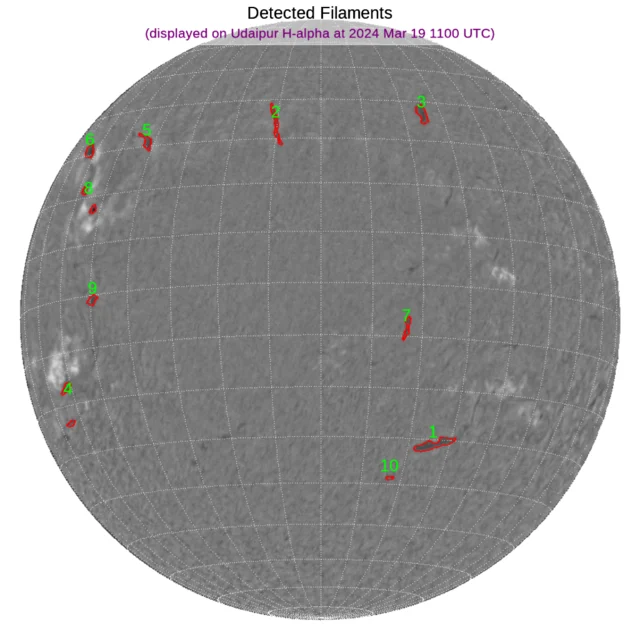 北半球のやや高緯度帯・東端と南半球西より・東端にフィラメントがあります