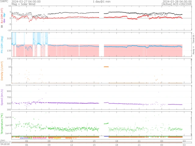 800km/sを超える突風がありましたが徐々に下がり、現在460km/s前後で推移しています
