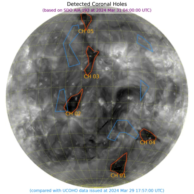 現時点で地球正面の黒点群はありません。←黒点番号が振られていない活動領域でもフレアは発生しますので、あくまで目安として捉えてください