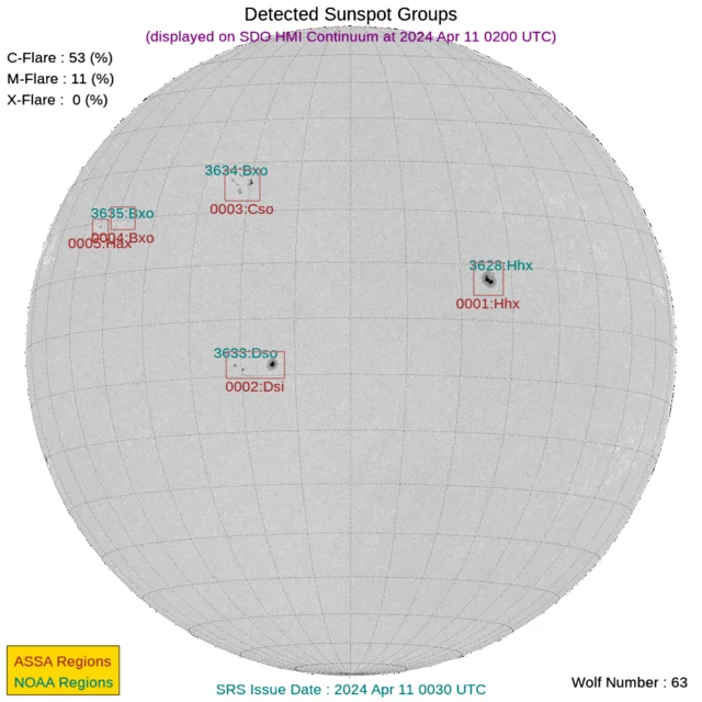 現時点で地球正面の黒点群は[3633, 3634]です。←黒点番号が振られていない活動領域でもフレアは発生しますので、あくまで目安として捉えてください。