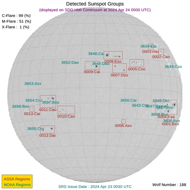現時点で地球正面の黒点群は[3644, 3646, 3652, 3657]です。←黒点番号が振られていない活動領域でもフレアは発生しますので、あくまで目安として捉えてください。