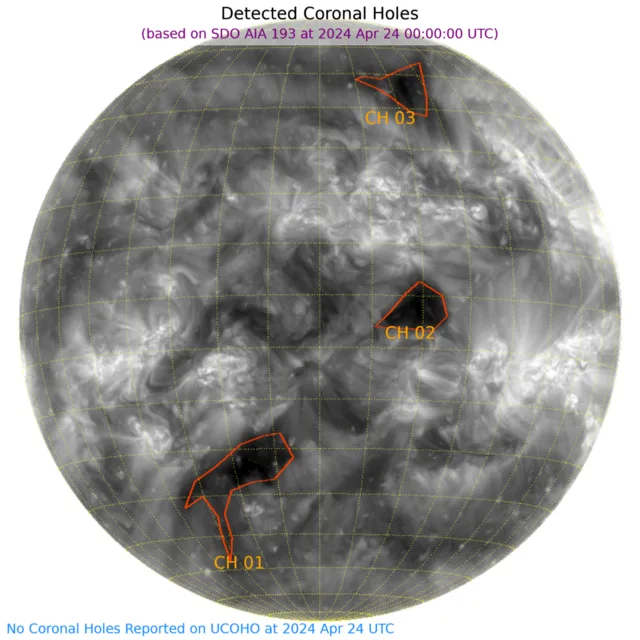 赤道付近西より、北半球西より、南半球東寄りにコロナホールがあります