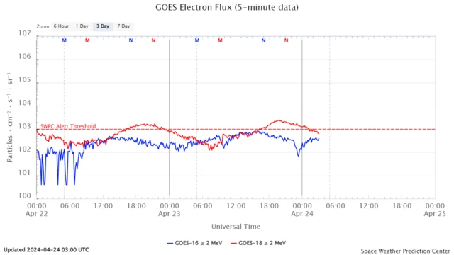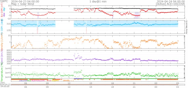 一時500km/sを超える太陽風が拭きましたが、速度は少し下がり現在360km/s前後で推移しています
