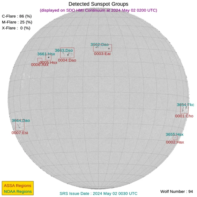 現時点で地球正面の黒点群は[3662]です。←黒点番号が振られていない活動領域でもフレアは発生しますので、あくまで目安として捉えてください。