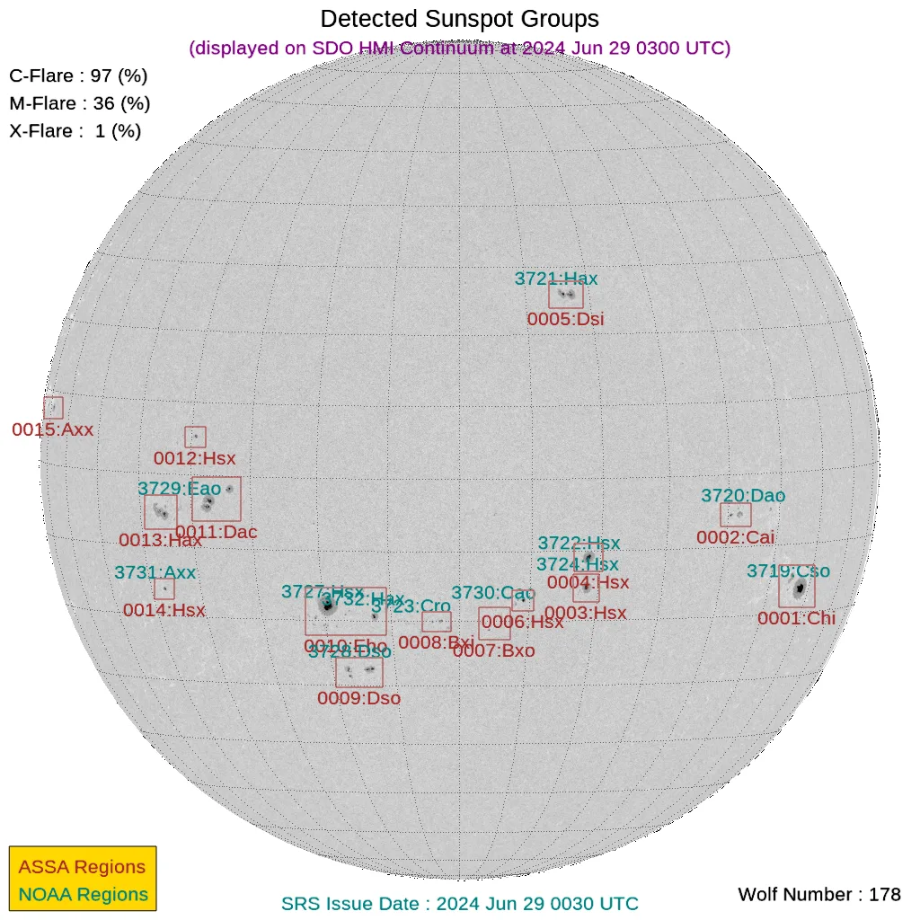 現時点で地球正面の黒点群は[3721, 3722, 3723, 3724, 3727, 3728, 3730, 3732]です。←黒点番号が振られていない活動領域でもフレアは発生しますので、あくまで目安として捉えてください。