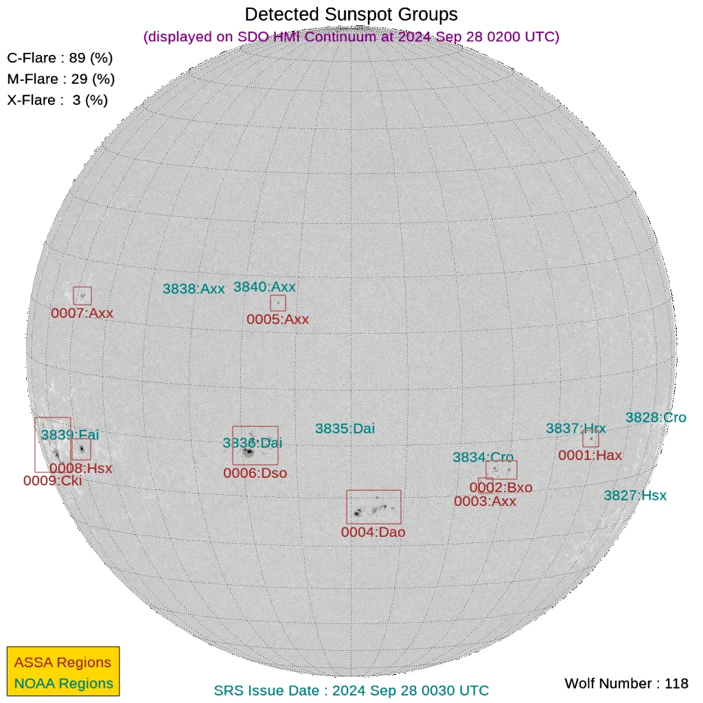 現時点で地球正面の黒点群は[3835, 3836, 3840]です。←黒点番号が振られていない活動領域でもフレアは発生しますので、あくまで目安として捉えてください。