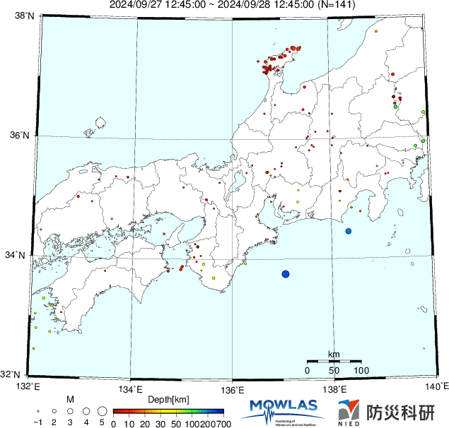 ●Hi-net日本地震分布と気象庁・・・hi-netの小笠原のデータは掲載日がずれて反映されるようです(翌々日に掲載)。掲載されないものもあるようなので気象庁の画像も付けます