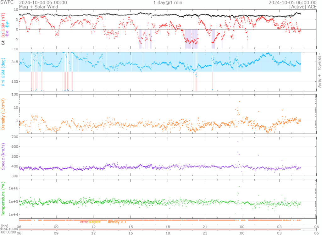 一時的に500~600km/sを超える突風が吹いているようですが、現在390km/s前後で推移しています