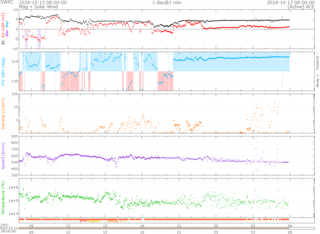 500km/s前後で推移していますが、時折800km/s越えの突風のような太陽風が吹いています