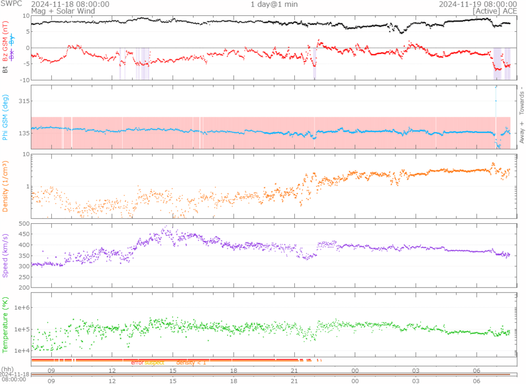 一時470km/s前後まで上がりましたが徐々に下がり、現在360km/s前後で推移しています