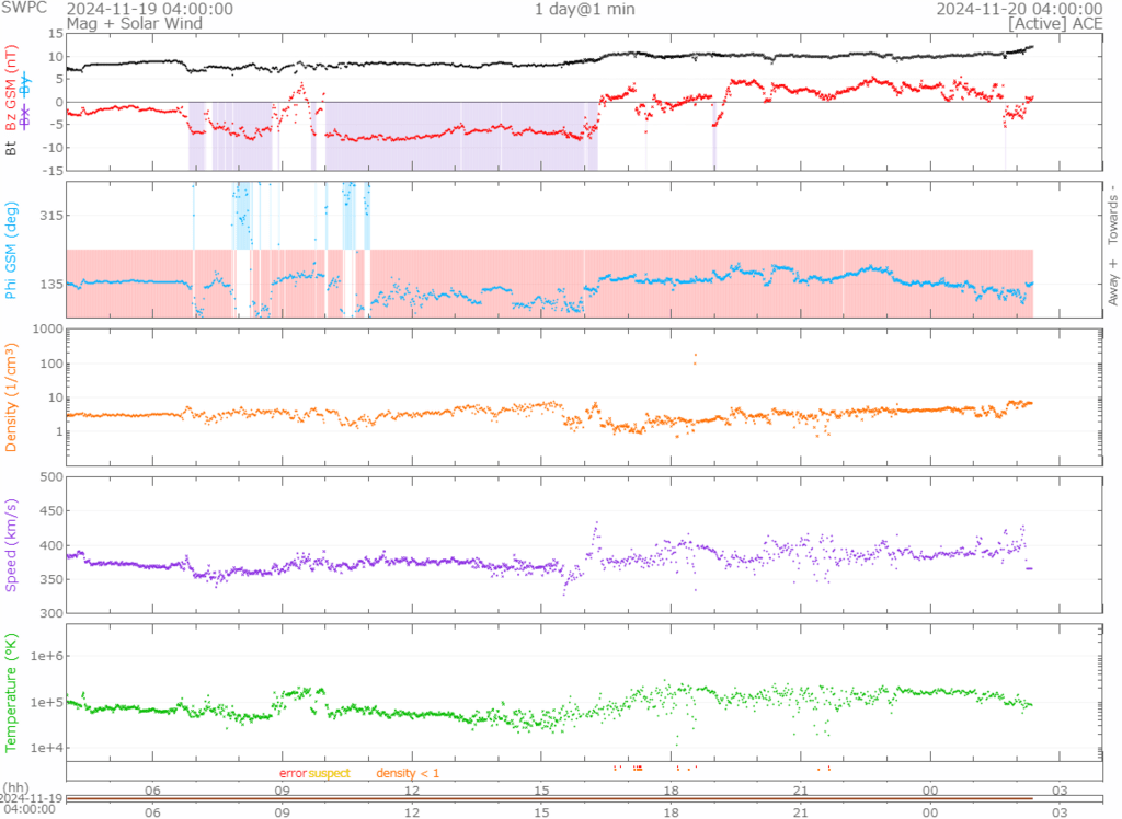 360km/s前後で推移していましたが一時420km/s前後で推移しました。現在は370km/s前後で推移しています