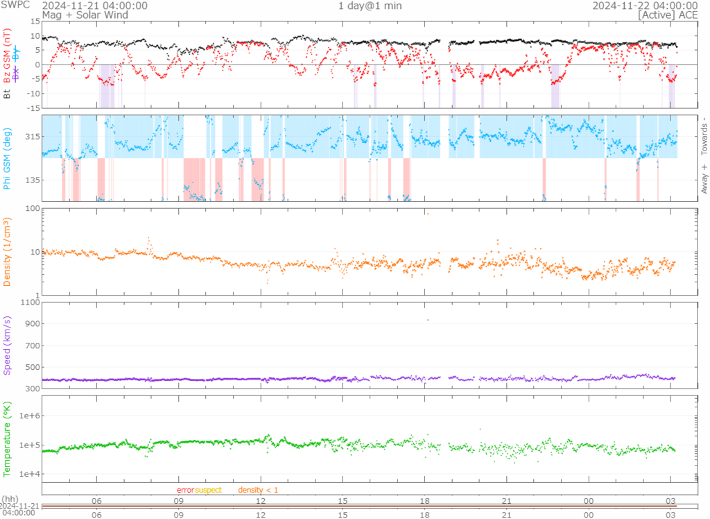 一瞬900km/sを越える突風があったようですが、引き続き380km/s前後で推移しています