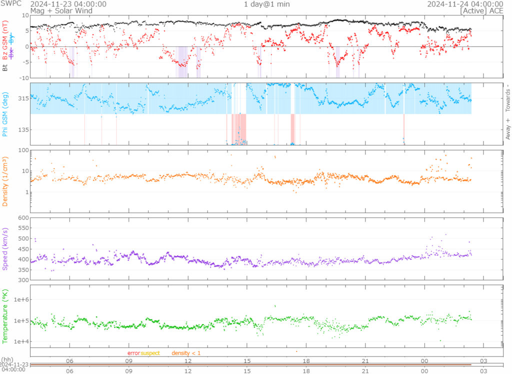 400km/s前後で推移していましたが少し上がり、時折500km/s前後の太陽風も吹いていますが430km/s前後で推移しています