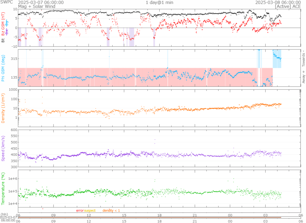 一時500km/sを越える突風があったようですが、引き続き410km/s前後で推移しています