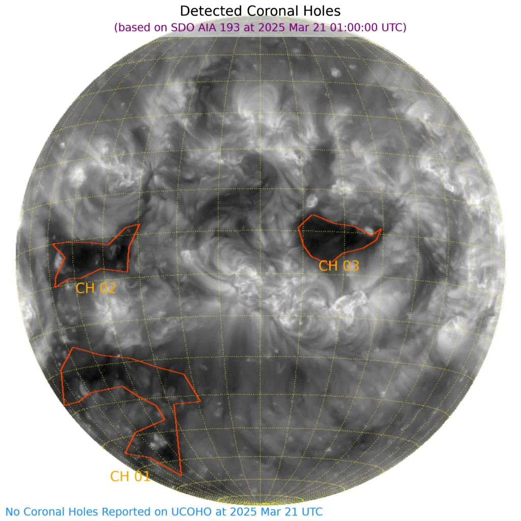 赤道付近西より、東側と、南半球東端にコロナホールがあります