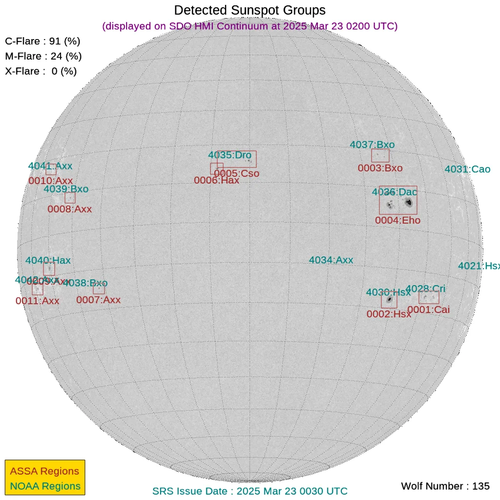 現時点で地球正面の黒点群は[4034, 4035]です。←黒点番号が振られていない活動領域でもフレアは発生しますので、あくまで目安として捉えてください。