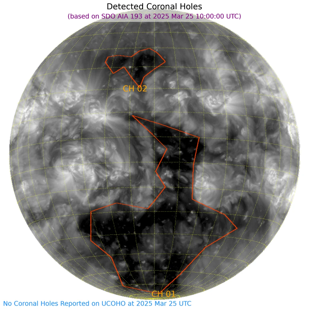 南の極付近から、南北は中心付近、東西は西よりから東よりにかけて広がるコロナホールがあります。