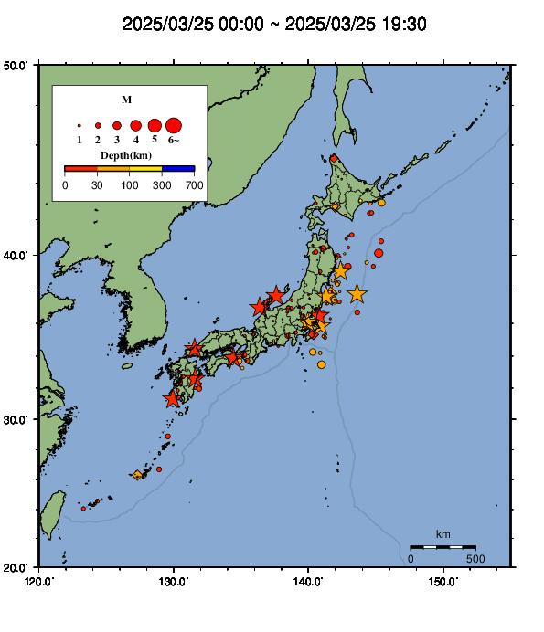 ●Hi-net日本地震分布と気象庁・・・hi-netの小笠原のデータは掲載日がずれて反映されるようです(翌々日に掲載)。掲載されないものもあるようなので気象庁の画像も付けます