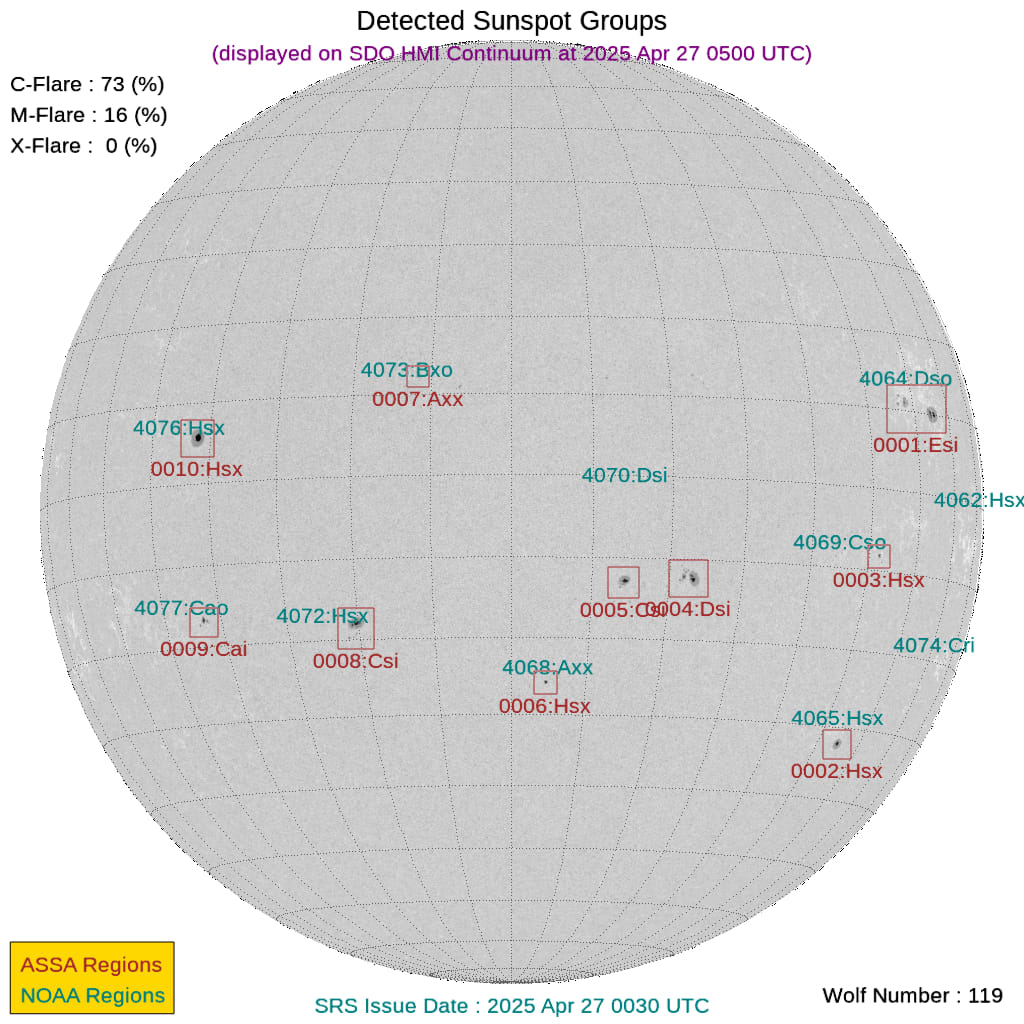 現時点で地球正面の黒点群は[4068, 4070, 4073]です。←黒点番号が振られていない活動領域でもフレアは発生しますので、あくまで目安として捉えてください。