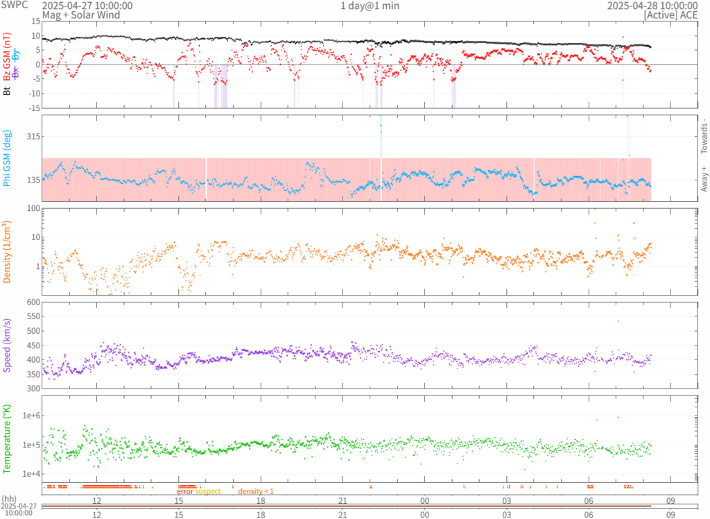 350~450 km/sで推移しており、CMEの影響は今のところ見られません