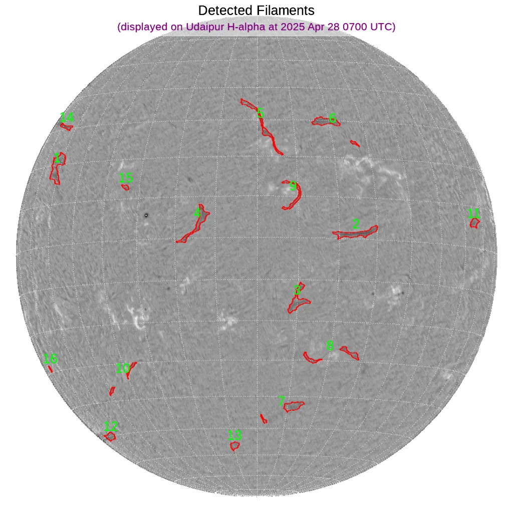 北半球中緯度帯から南半球やや高緯度帯までの間にフィラメントが散在しています