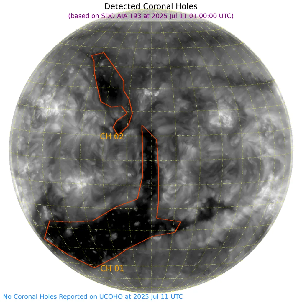 北半球東側と、中央付近から南半球東端にのびるコロナホールがあります