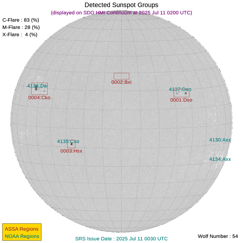 現時点で地球正面の黒点群はありません。←黒点番号が振られていない活動領域でもフレアは発生しますので、あくまで目安として捉えてください。
