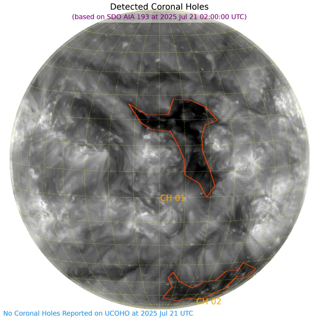 赤道付近西よりから北半球東寄りにかけて南北に広がるコロナホールがあります