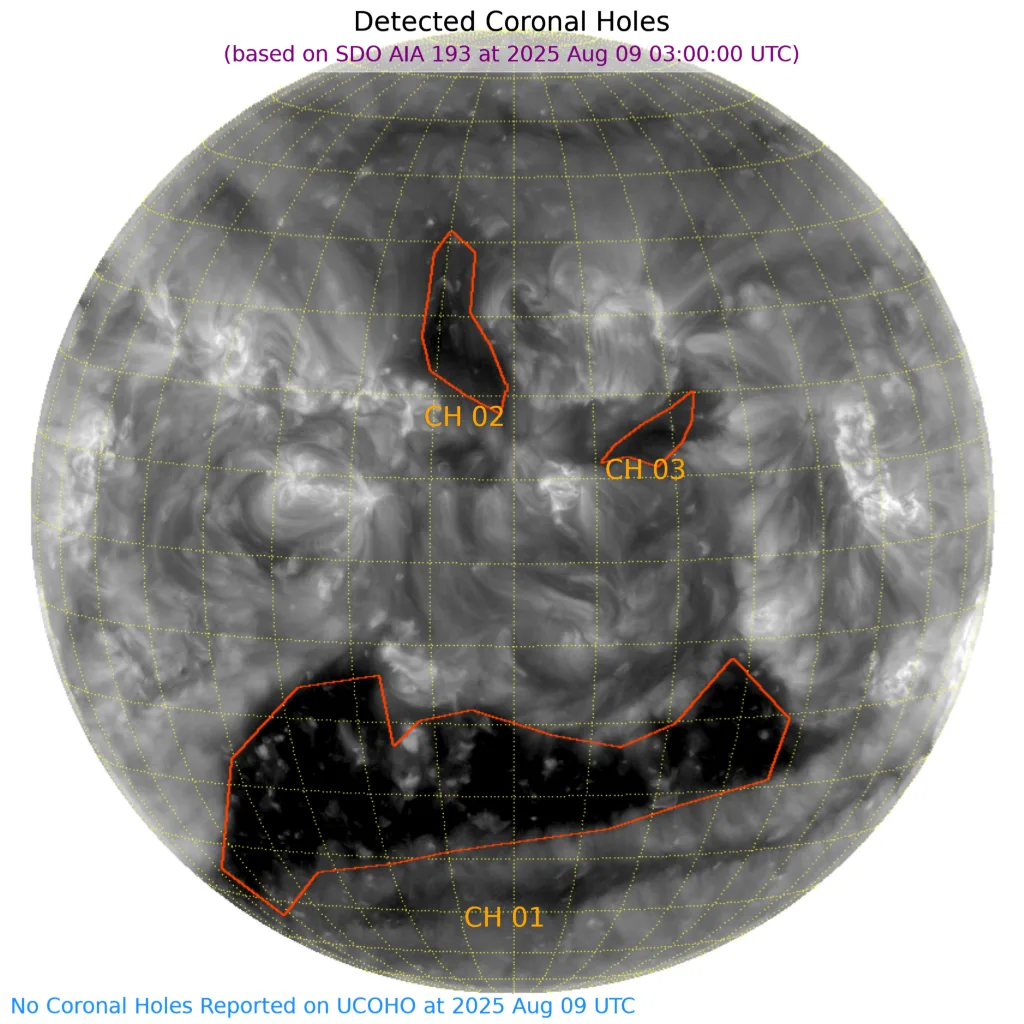 赤道やや西よりと、北半球東寄りにもコロナホールがあります