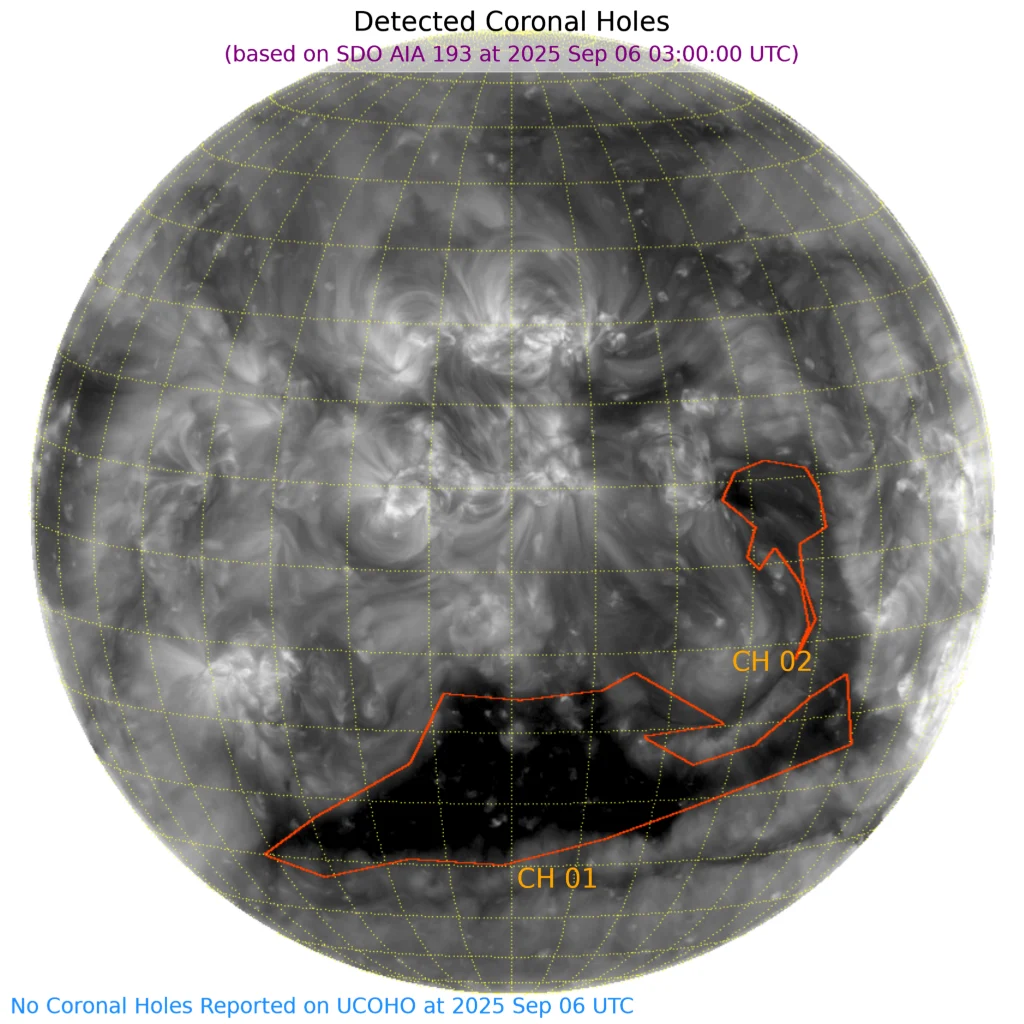 南半球東側から西側にかけて東西に広がるコロナホールがあります