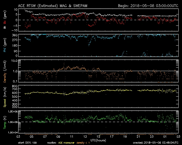 一時的に1,000km/sを超える突風が吹いているようです。速度は少し上がり、現在690km/s前後で推移しています