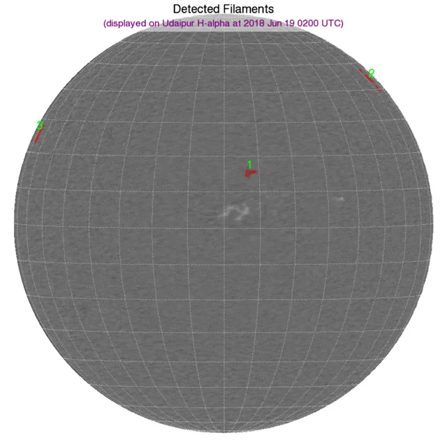 ※フィラメント:正面付近と北半球西端と東端に小さなコロナホールがあります。
