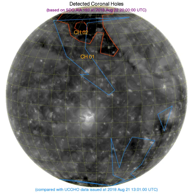 北の極から北半球(高緯度)西寄りにかけてコロナホールがあります。