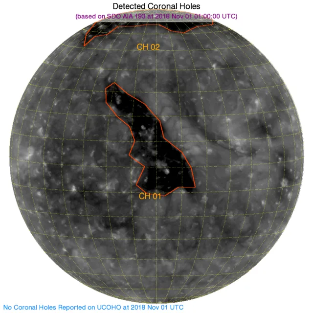 赤道付近東寄りのコロナホールは更に発達して正面へ移動。こちらの影響が3日くらいから届き始めるかも