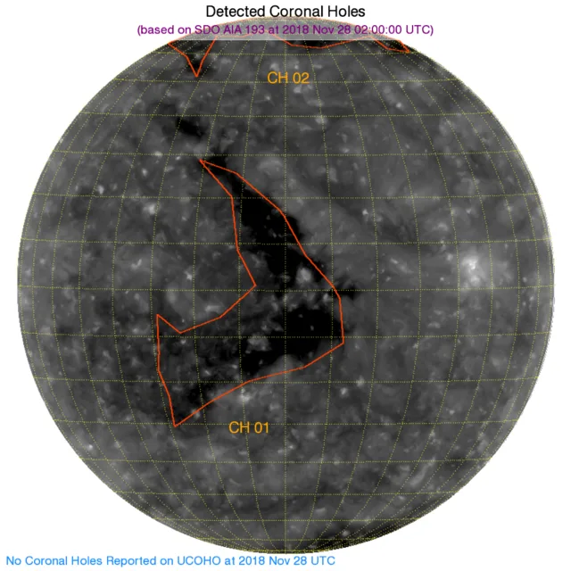ほぼ正面にある巨大なコロナホールは、北半球から南半球にかけて広がっています。こちらの影響が30日くらいから届き始めるかも