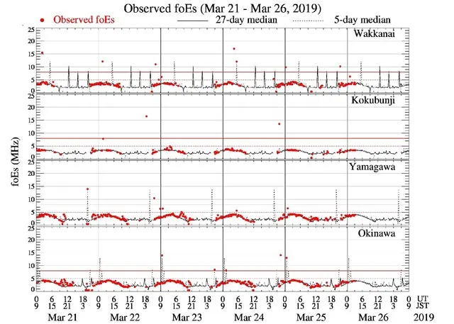 所々反応があります。03/26 02時(UT)過ぎから落ち込んでいます。この後乱れや反応が出るようなら要注意。